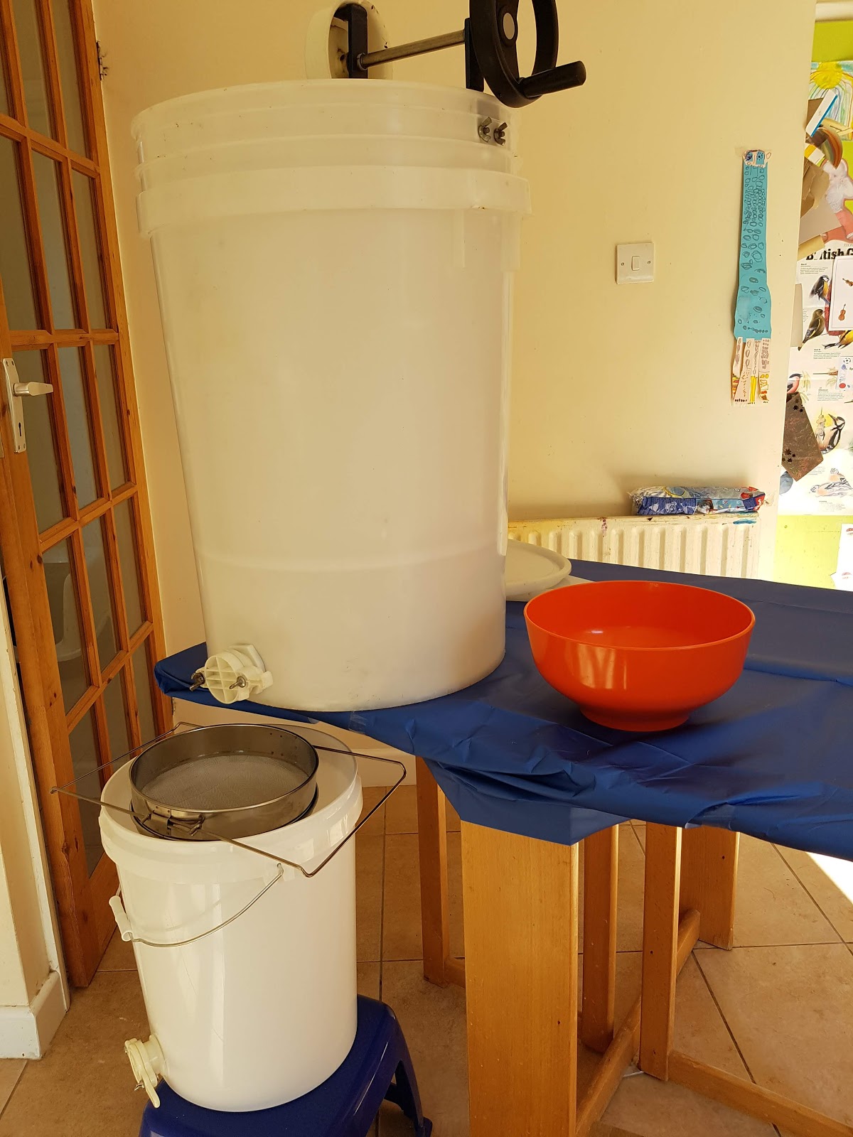 After this the honey can be extracted in the extractor. This is a barrel which you spin around by a handle after you have fixed the frames inside. One important things to remember – don’t spin too hard as the frames collapse from excessive centrifugal force – this would have been useful to know beforehand. The honey is forced out on the outside wall of the barrel and then drips down in to the bottom. Eventually all your honey is off the frames and sitting ready to be filtered.